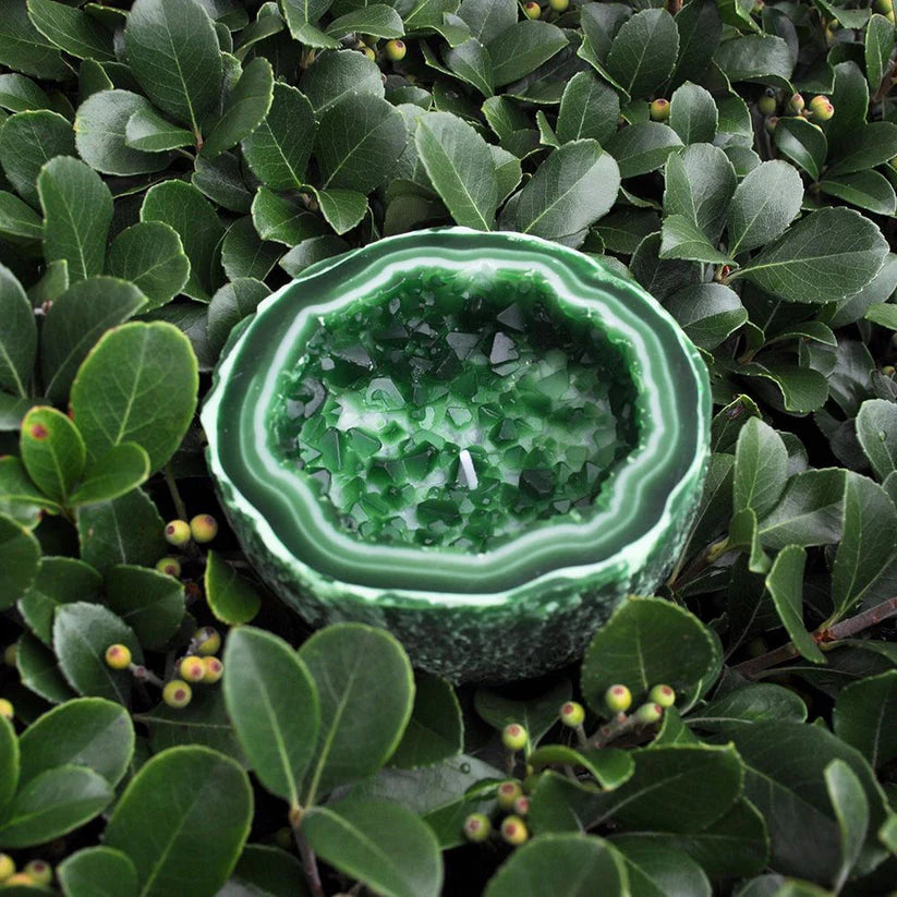 Inspired by the wonder of opening geodes, our 100% wax candles feature a sparkling crystal bed and rings of natural agate.